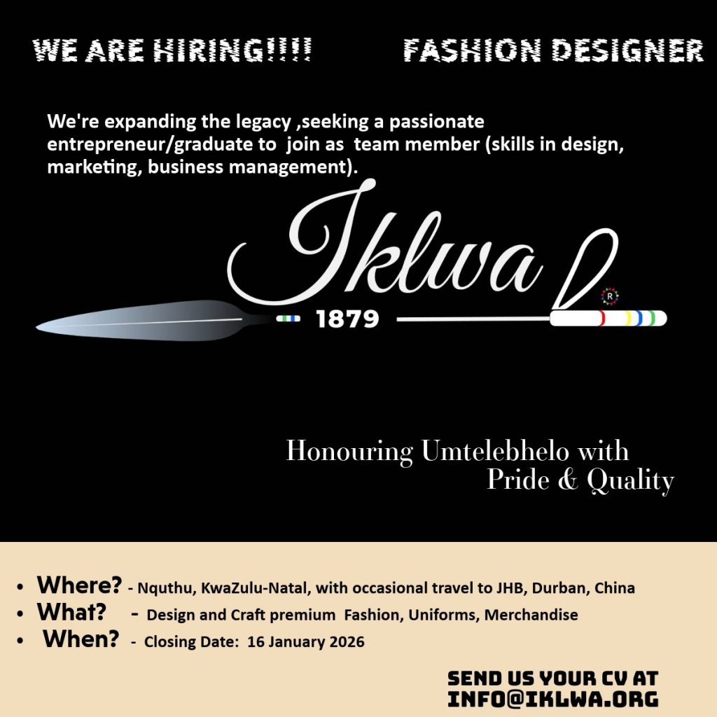 Join us in honouring Umtelebhelo with pride and quality. Iklwa is expanding its legacy and seeking a passionate entrepreneur or fashion graduate with skills in design, marketing, and business management. The posistion is based in Nquthu, KwaZulu-Natal, with travel to JHB, Durban, and China, this is your chance to shape premium fashion, uniforms, and merchandise rooted in heritage.
